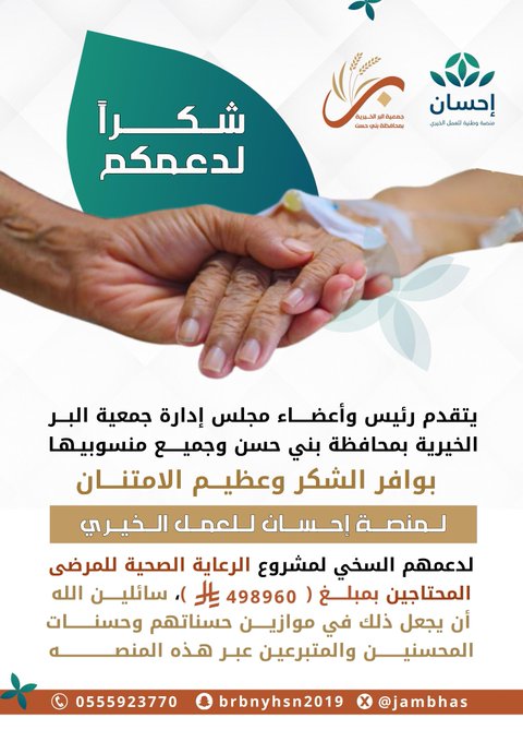 يتقدم رئيس وأعضاء مجلس إدارة جمعية البر الخيرية بمحافظة بني حسن وجميع منسوبيها بوافر الشكر وعظيم الإمتنان لـ #منصة_إحسان للعمل الخيري لدعمهم السخي لمشروع الرعاية الصحية للمرضى المحتاجين بمبلغ ( 498960 ريال )، سائلين الله أن يجعل ذلك في موازين حسناتهم وحسنات المحسنين والمتبرعين عبر هذه المنصة.