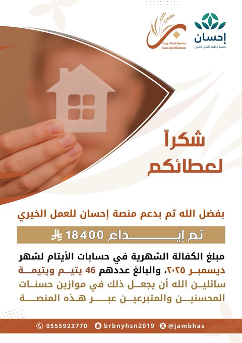 بفضل الله ثم بدعم #منصة_إحسان للعمل الخيري تم إيداع ١٨٤٠٠﷼ مبلغ #الكفالة_الشهرية في حسابات الأيتام لشهر ديسمبر 2025 م