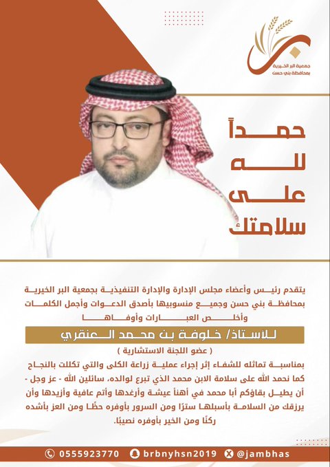 جمعية البر تهنئ الأستاذ خلوفة العنقري بسلامته