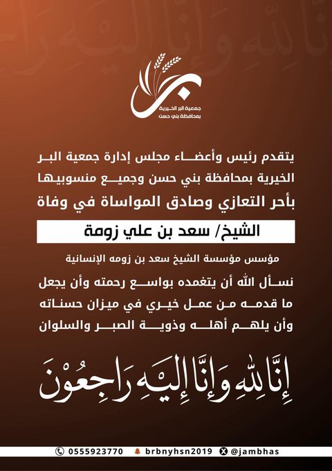 بصادق التعازي والمواساة في وفاة الشيخ سعد بن علي زومة