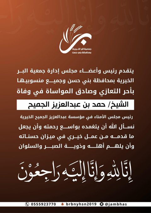 بأحر التعازي وصادق المواساة في وفاة الشيخ حمد بن عبدالعزيز الجميح